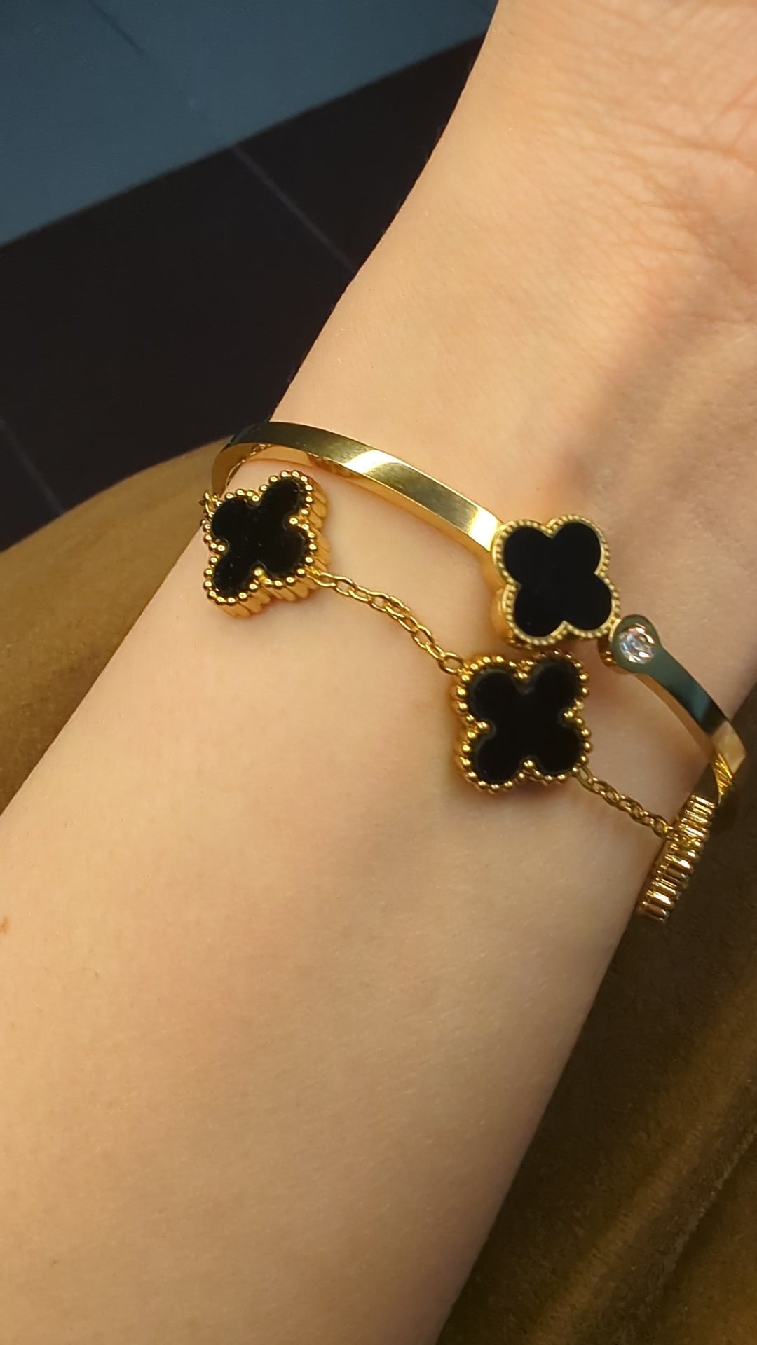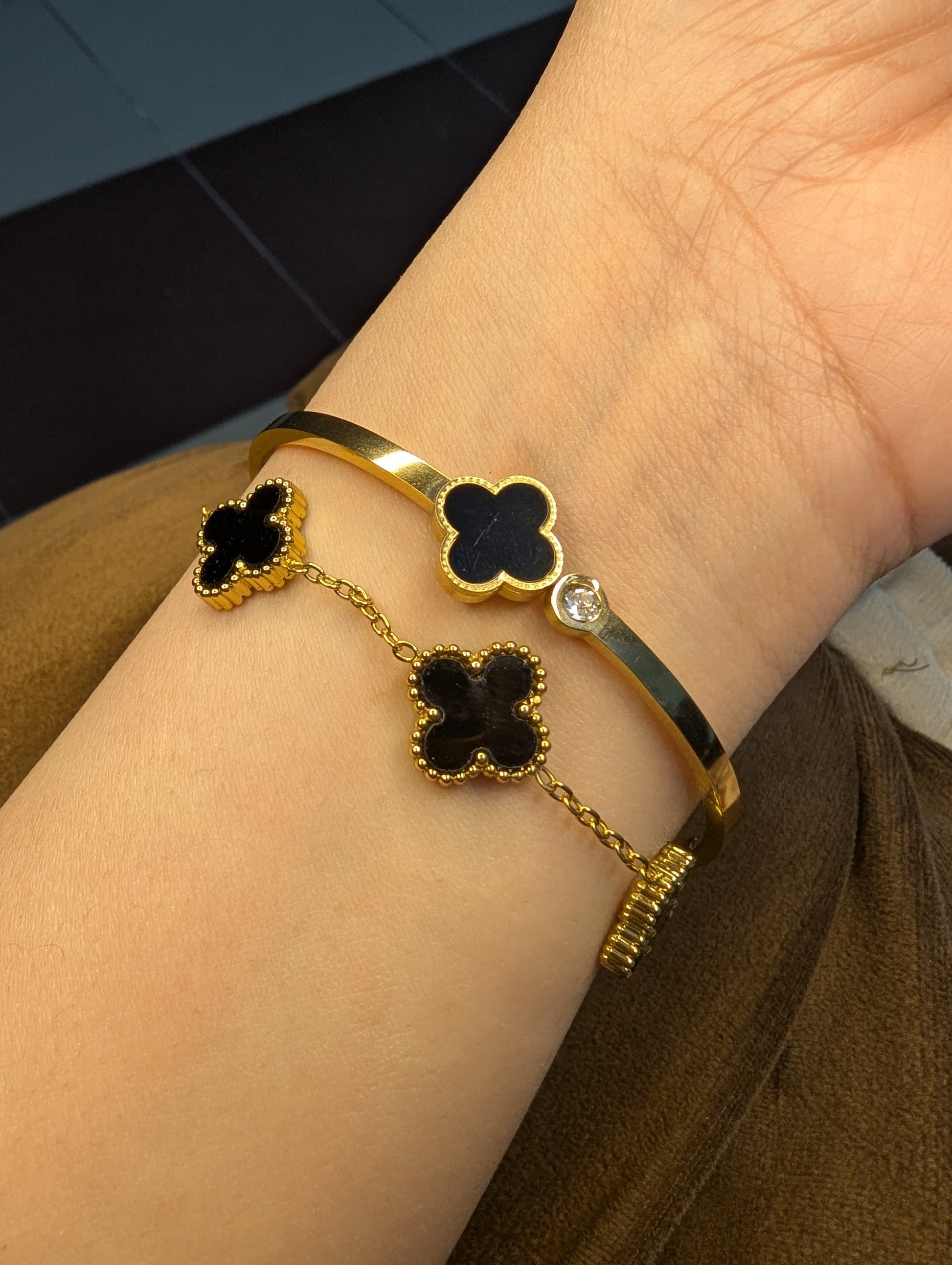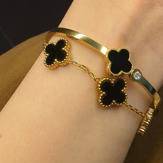 The sleek handcuff bangle adds structure and shine, while the delicate clover chain bracelet brings movement and charm—creating the perfect layered combination.